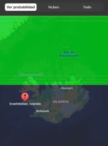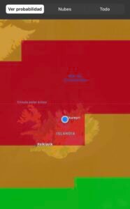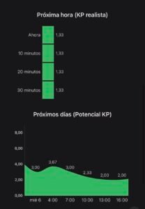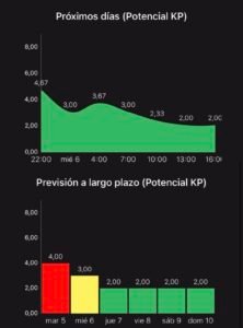 Al inicio te sale un mapa con tu ubicación y la probabilidad de verlas por colores (verde, naranja y rojo), potencial KP actual y  el de los próximos días, la cobertura de nubes, la mejor hora para verlas, y la previsión a largo plazo.