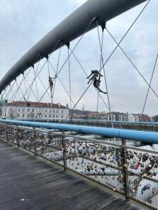 Puente del padre Bernatek, o puente del amor, ya que en él está lleno de candados, cómo la mayoría de las ciudades europeas. Con figuras de gimnastas. Se cruza el río Vístula desde el barrio de Kazimierz a el gueto de Podgórze.